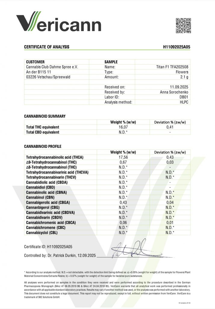 Die Cannabis-Sorte Titan F1 ist ein selbstblühender (autoflowering) F1-Hybrid, bekannt für ihren extrem hohen THC-Gehalt (oft > 25%) und ihre gleichmäßigen, robusten Wachstumseigenschaften. Sie stammt von den Genetiken Blue Dream, Sugar Magnolia und Amnesia ab und bietet eine ausgewogene Wirkung, die körperliche Entspannung mit geistiger Klarheit verbindet.